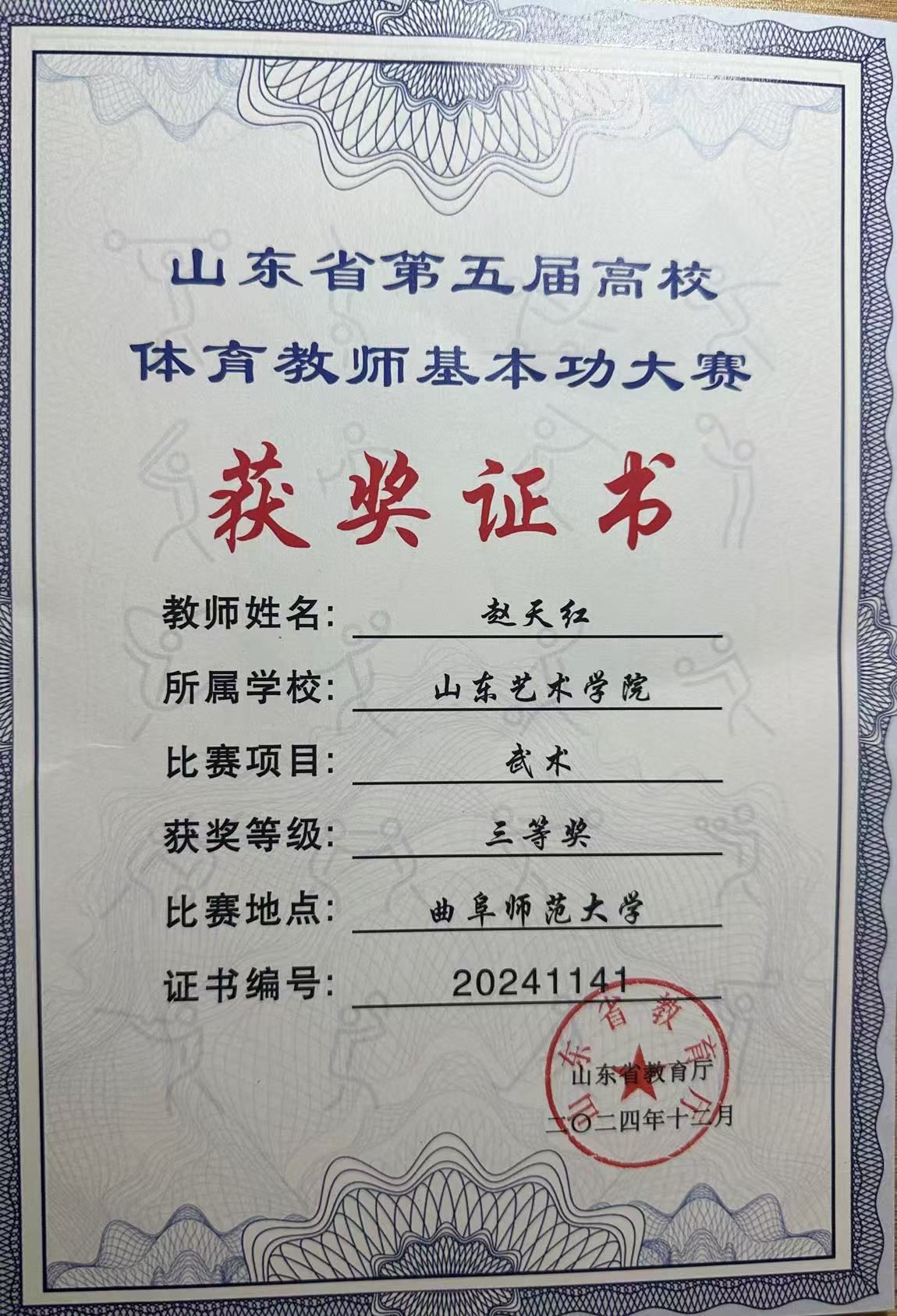 近日,山东省第五届高等学校体育教师基本功大赛落下帷幕,我校公共教育学院教师赵天红在比赛中稳扎稳打,奋力拼搏,取得了武术男子丙组三等奖的好成绩,展现了我校教师扎实的专业素养和公共教育学院教师队伍建设成果。